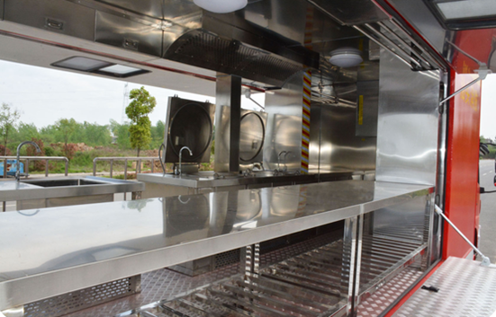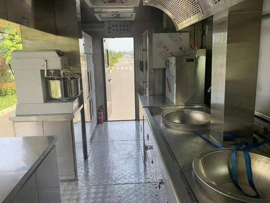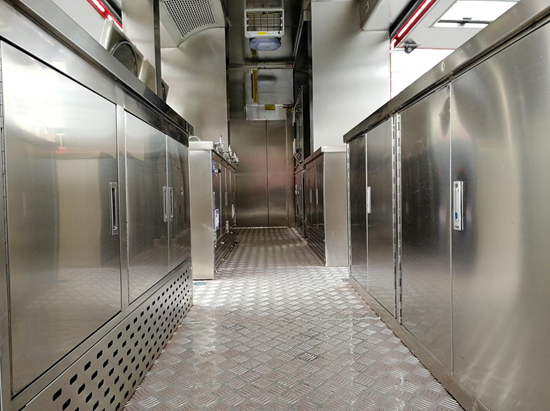 结合保障餐车实际情况,箱体内分为烹饪区、洗涤区,切菜区,调和区,蒸饭区,冷冻储藏区,车辆箱体中部为烹饪区 |
