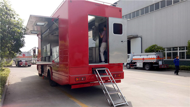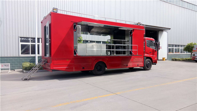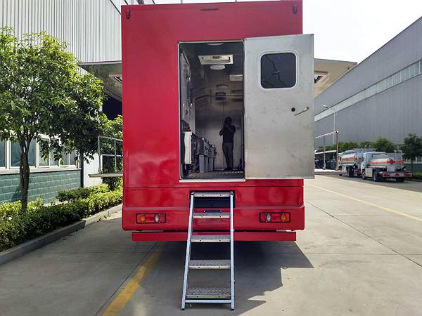 东风天锦底盘、箱体、(外部采用2mm铝平板、内部1.5mm不锈钢板)净水箱(1500L)、污水箱(约260L)、(水、电、油)**系统、汽油发电机、吸水泵、直流自吸油泵、电热水器、车载冰箱、炒菜灶、炖菜灶、