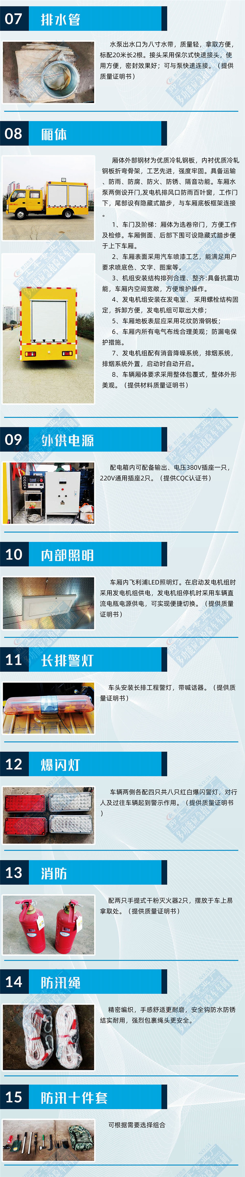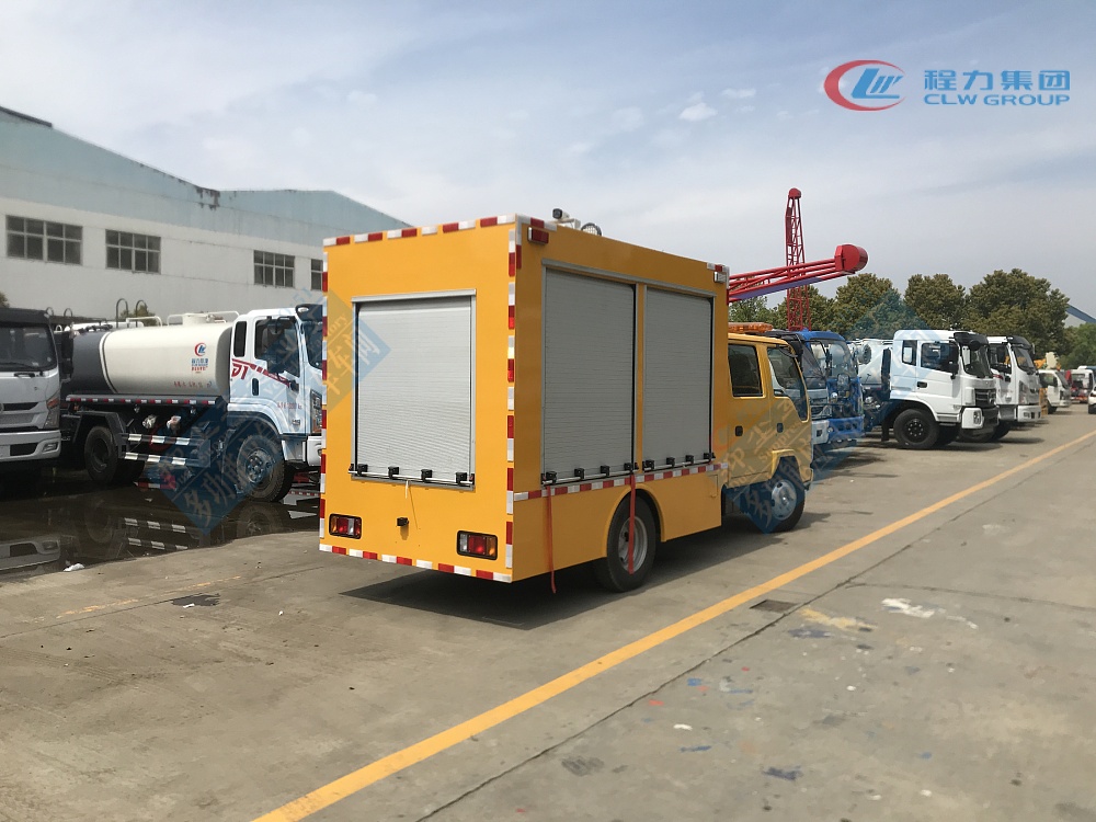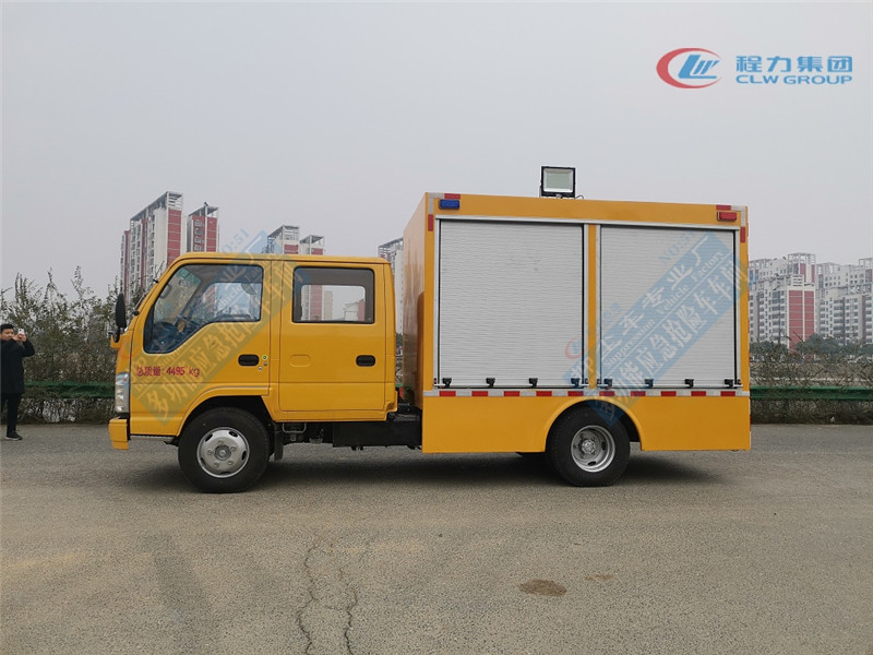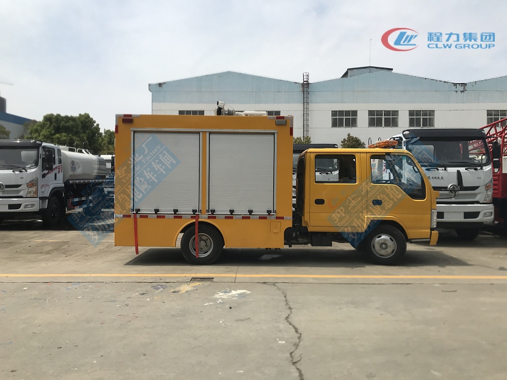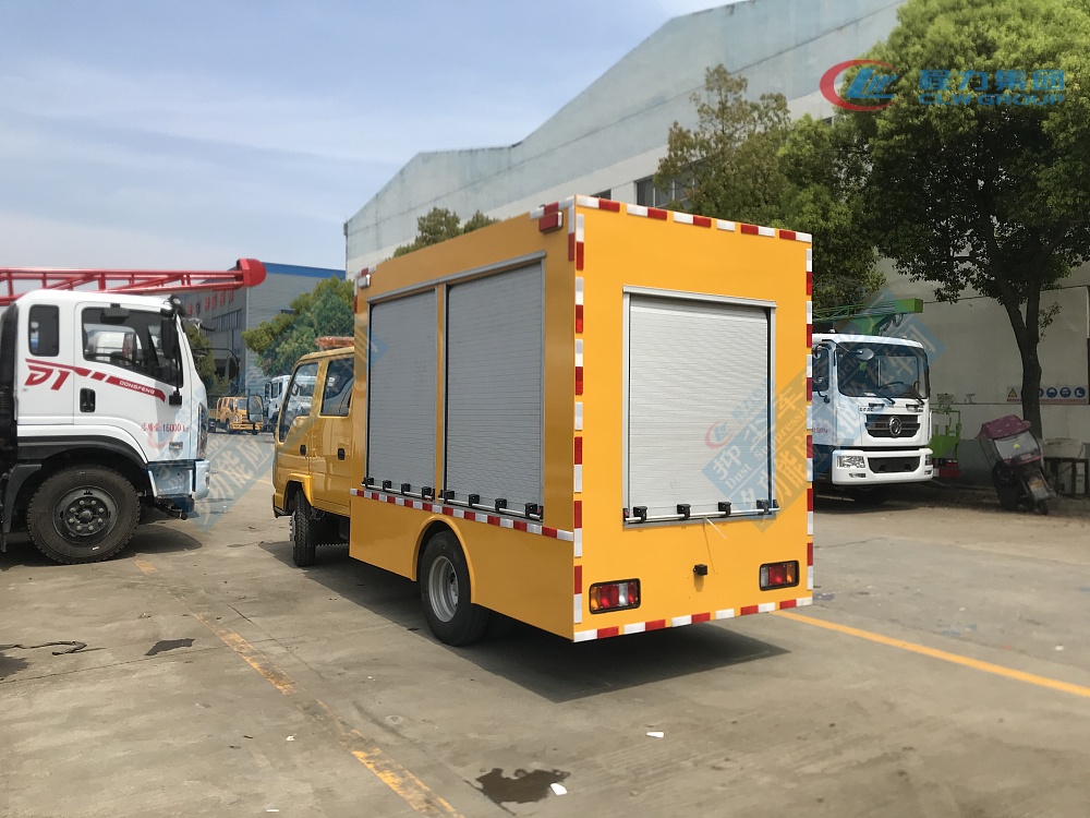 选装配置:选装行李架、爬梯、车顶工作台;选装不同形状、结构的**示灯;选装中隔断(可选择开门)、车身两侧可选开上掀门、盲窗、侧开门;花纹铝板;加装设备工具柜、配电箱、发电机组、水泵、电焊机、空压机等线路安装外接电源系统、(室内灯光照明、探照灯、高杆照明灯等);绕线盘,还可根据用户不同需求加装不同的维修抢险设备、车身制作专用图案或标识。