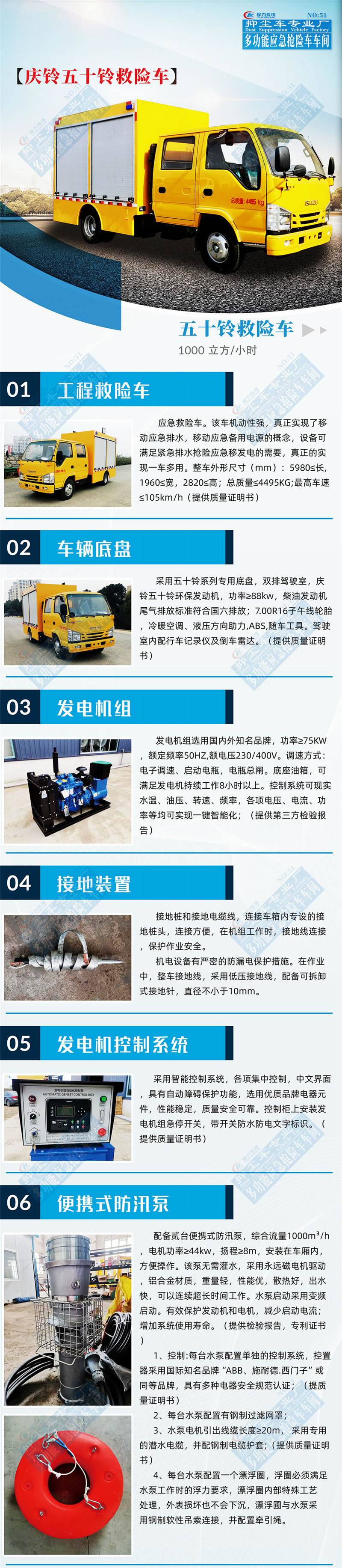 工程抢险车配备多台便携式潜水泵,泵体装有提手,方便搬运。水泵泵体采用高强度轻质铝合金材质制作,叶轮采用耐磨、耐腐蚀优质不锈钢制作,一体成型,潜水深度20米;水泵配有不锈钢丝滤网,有效阻止垃圾堵塞,损坏水泵;每台水泵上安装20米潜水电缆,电缆与**柜之间采用防护等级IP67的快速插头连接,操作简单,使用安全。单泵配置聚胺脂高强度浮圈,一体成型,满足水泵工作时的浮力要求,具卡口吊环连接软性吊索;水泵可以使用发电机组或市电正常工作。