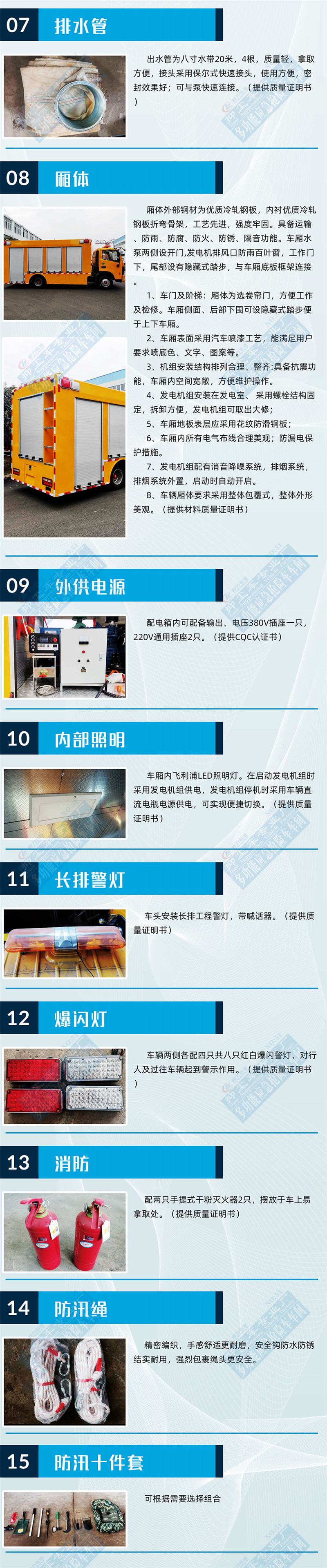 选装配置:选装行李架、爬梯、车顶工作台;选装不同形状、结构的**示灯;选装中隔断(可选择开门)、车身两侧可选开上掀门、盲窗、侧开门;花纹铝板;加装设备工具柜、配电箱、发电机组、水泵、电焊机、空压机等线路安装外接电源系统、(室内灯光照明、探照灯、高杆照明灯等);绕线盘,还可根据用户不同需求加装不同的维修抢险设备、车身制作专用图案或标识。